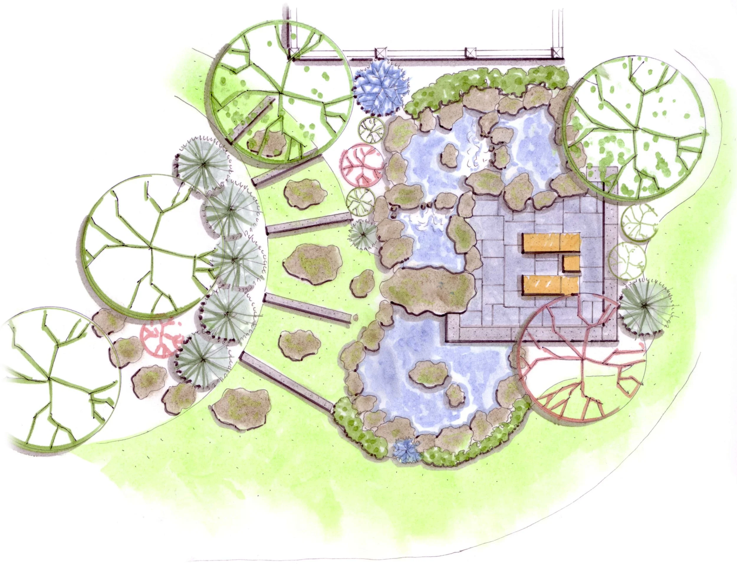 The initial phase of design begins with a discussion of design goals, budget considerations and project timelines. Time is spent walking the site and discussing opportunities and challenges with existing topography, site conditions, current architecture, etc. We also review client image folders that depict completed landscape projects, preferred architectural styles, materials, pool designs, outdoor furniture, plants, etc. that reflect the client's design language. Plot plans and architectural plans provide a base layout from which to start design concepts. Initial design layouts will vary in scope, design aesthetics and budget to explore various options and allow the client to visually understand design details and make informed decisions.